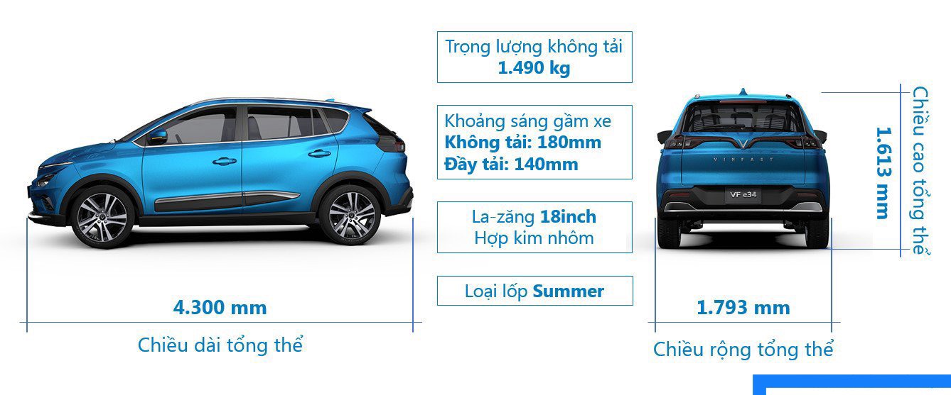 VinFast VF e34 là mẫu ô tô điện thuộc phân khúc C, từng được công bố vào tháng 1/2021 với tên mã VF31. Xe có chiều dài cơ sở 2.611mm, kích thước các chiều dài x rộng x cao là 4.300 x 1.793 x 1.613 (mm), khoảng sáng gầm xe 180mm, trọng lượng không tải 1.490kg. VinFast VF e34 được trang bị một động cơ điện có công suất tối đa 110 kW, mô-men xoắn cực đại 242 Nm cùng hệ dẫn động cầu trước, hệ thống treo trước MacPherson, hệ thống treo sau dạng thanh xoắn. Xe sử dụng một bộ pin dung lượng 42kWh, có thể đi được quãng đường 300km sau mỗi lần sạc đầy. Để minh chứng cho đẳng cấp, chất lượng và tạo sự an tâm cho khách hàng, VinFast tiên phong áp dụng chính sách bảo hành lên tới 10 năm cho xe VF e34.